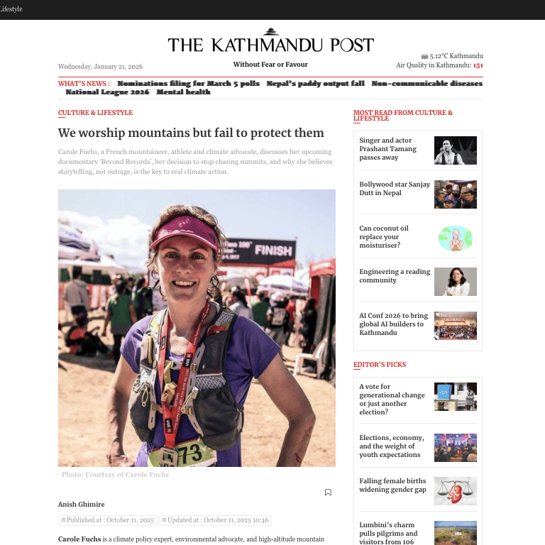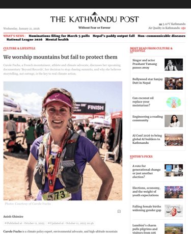 Carole Fuchs, a French mountaineer, athlete and climate advocate, discusses her upcoming documentary ‘Beyond Records’, her decision to stop chasing summits, and why she believes storytelling, not outrage, is the key to real climate action.